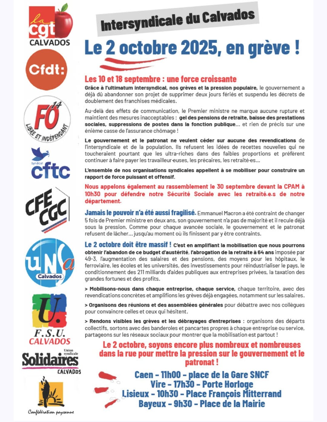 - Appel unitaire des organisation syndicales du Calvados : Manifestations du 2 octobre 2025
