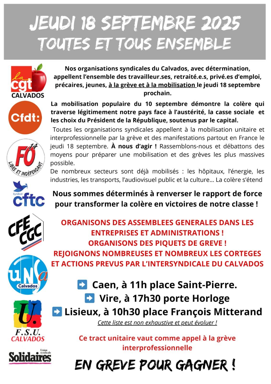 - Appel unitaire des organisation syndicales du Calvados : Manifestations du 18 septembre 2025