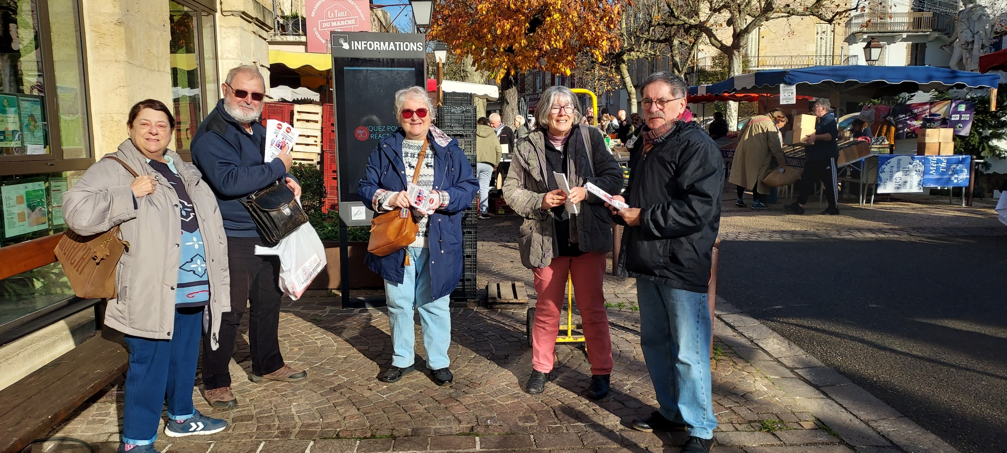 En plein cœur de l’automne, par un matin ensoleillé avec une météo agréable, nous avons fait une distribution de flyers sur le marché de Prayssac. Un marché charmant et pittoresque qui entoure l’église. Pour la distribution nous avons décidé de nous diviser en deux équipes : une à gauche et une à droite, pour nous retrouver de l’autre côté. Nous avons eu des discussions courtoises, notamment avec un membre retraité de la CGT des chantiers navals. Notre objectif principal était de faire la promotion du syndicat CFDT des retraités auprès des personnes âgées qui étaient nombreuses ce douze décembre 2025. Maintenant nous attendons que notre distribution porte ses fruits en matière de développement.